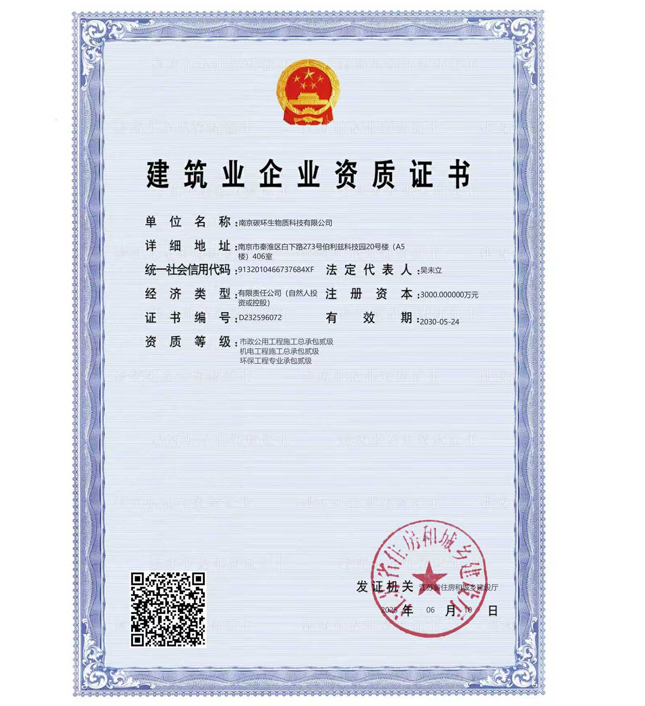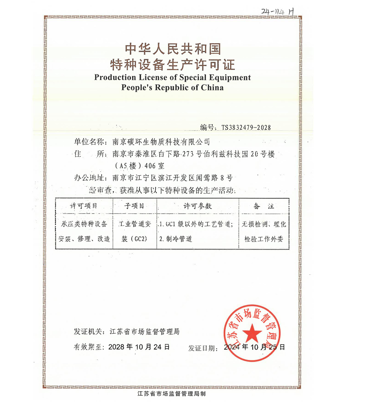 南京碳環(huán)生物質(zhì)科技有限公司還有:環(huán)保工程總承包資質(zhì)、壓力管道安裝資質(zhì)、機(jī)電設(shè)備安裝資質(zhì)等。