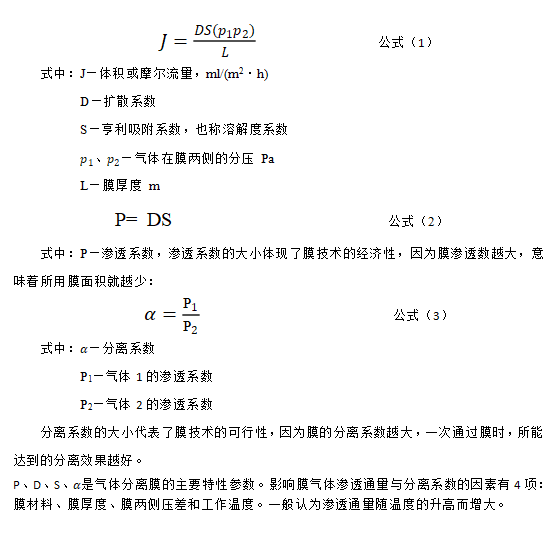 經(jīng)過以下3個步驟,由膜的高分壓側(cè)透過膜到達(dá)低分壓側(cè):①氣體吸附溶解在膜的高分壓側(cè);②在濃度差的作用下,溶解在高分壓側(cè)膜表面的氣體向低分壓側(cè)表面擴(kuò)散;③到達(dá)低分壓側(cè)膜表面的氣體從膜體中解吸。